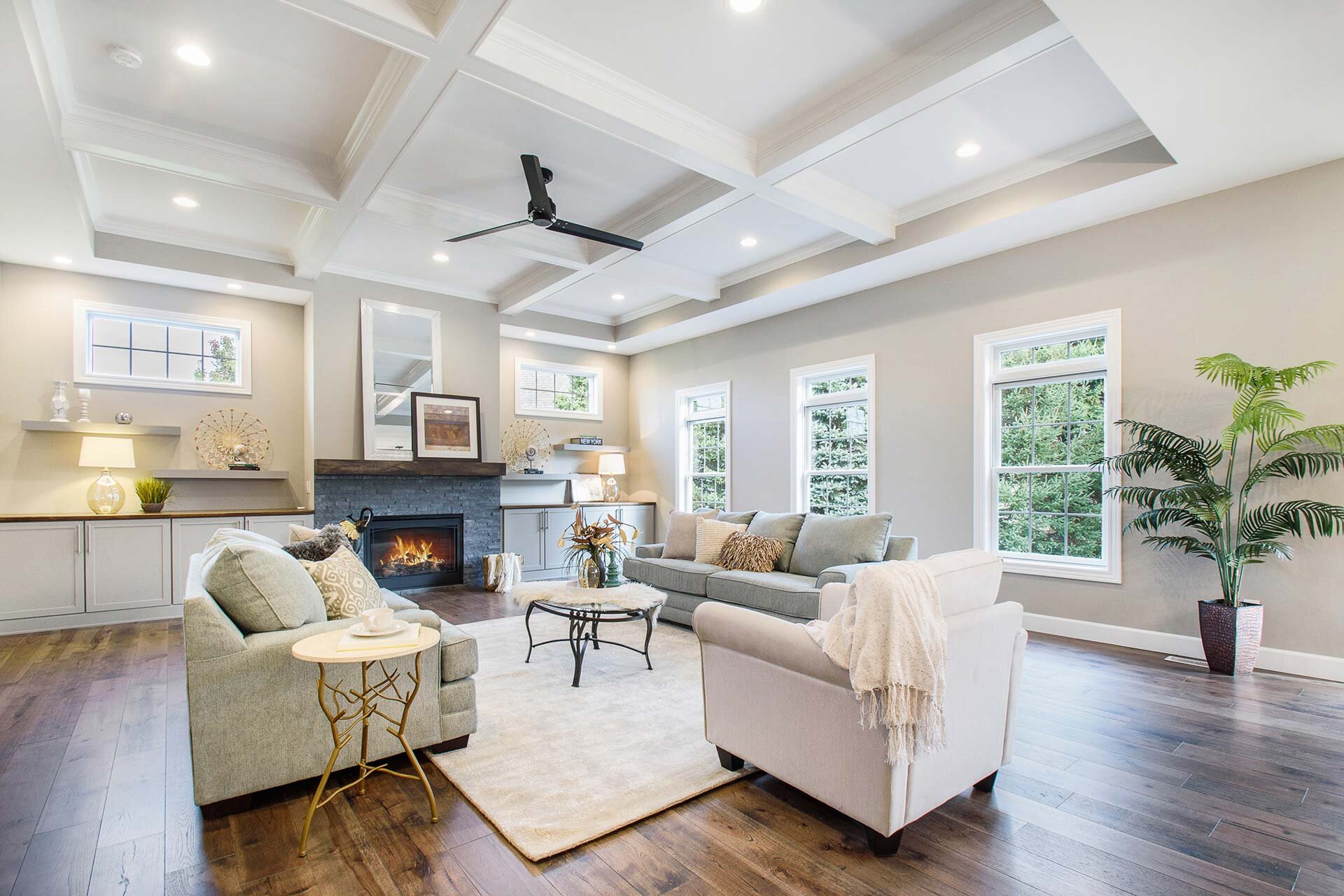 - 10 ft tray coffered ceiling and fireplace with built-in cabinetry in the great room